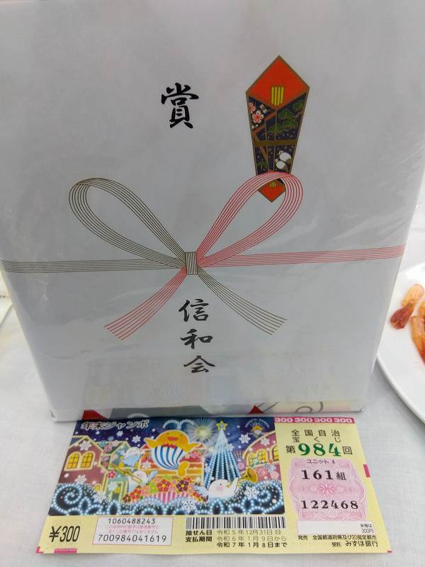 ビンゴゲームは、当たらなかったのですが、宝くじは、ぐるめ食品の鮭トバなどの詰め合わせをゲット。
